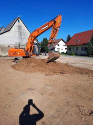Am Anfang der Errichtung eines größeren Gebäudes steht die Baugrube, ob für einen Keller, eine Tiefgarage oder für die Betonierung des Fundaments. Natürlich erledigen wir den Aushub auch, wenn Sie zum Beispiel in Ihrem Garten gerne einen Pool haben möchten. Wir verfügen dazu über einen entsprechenden Maschinenpark mit Baggern und Radladern unterschiedlicher Größe.